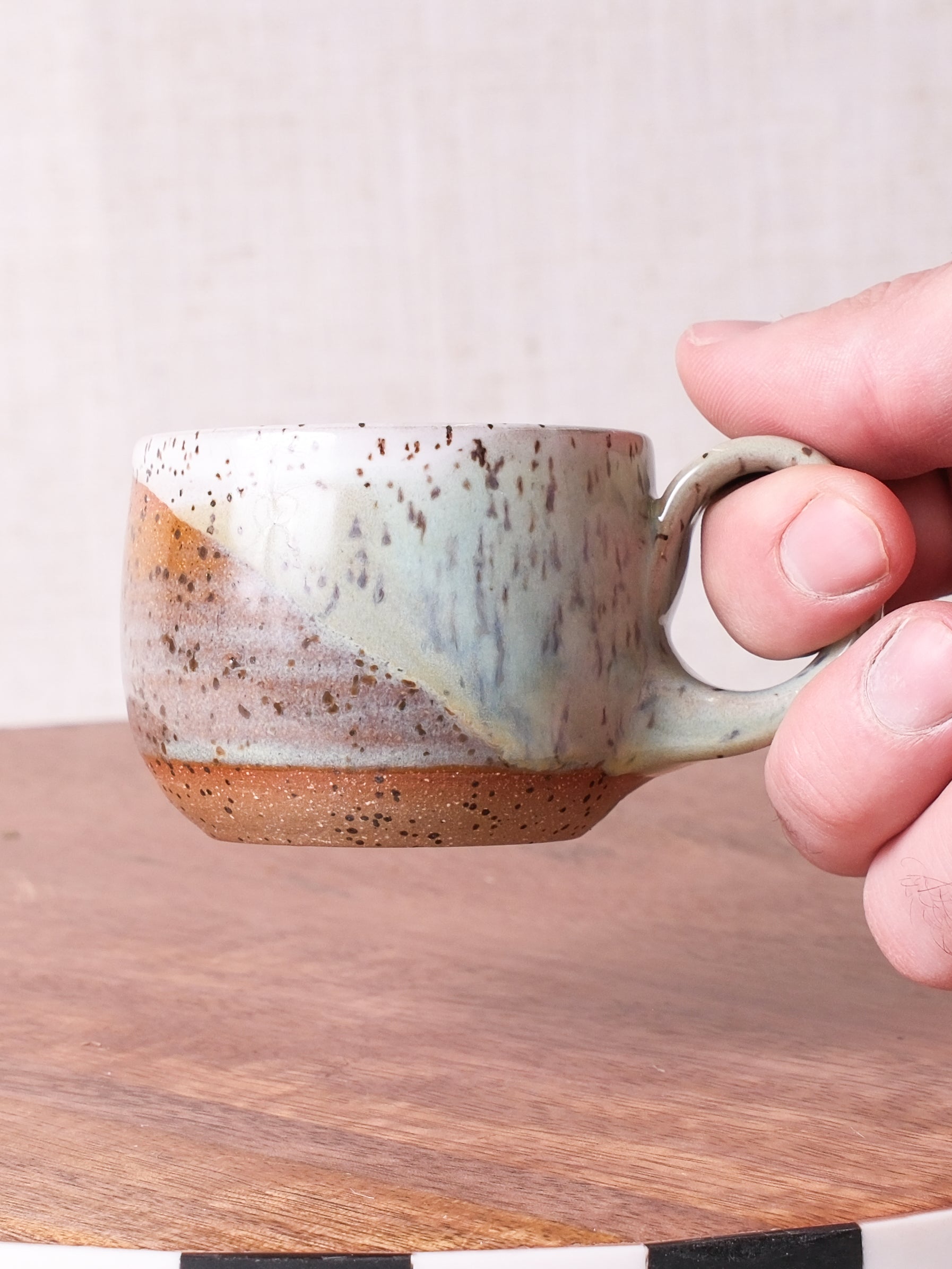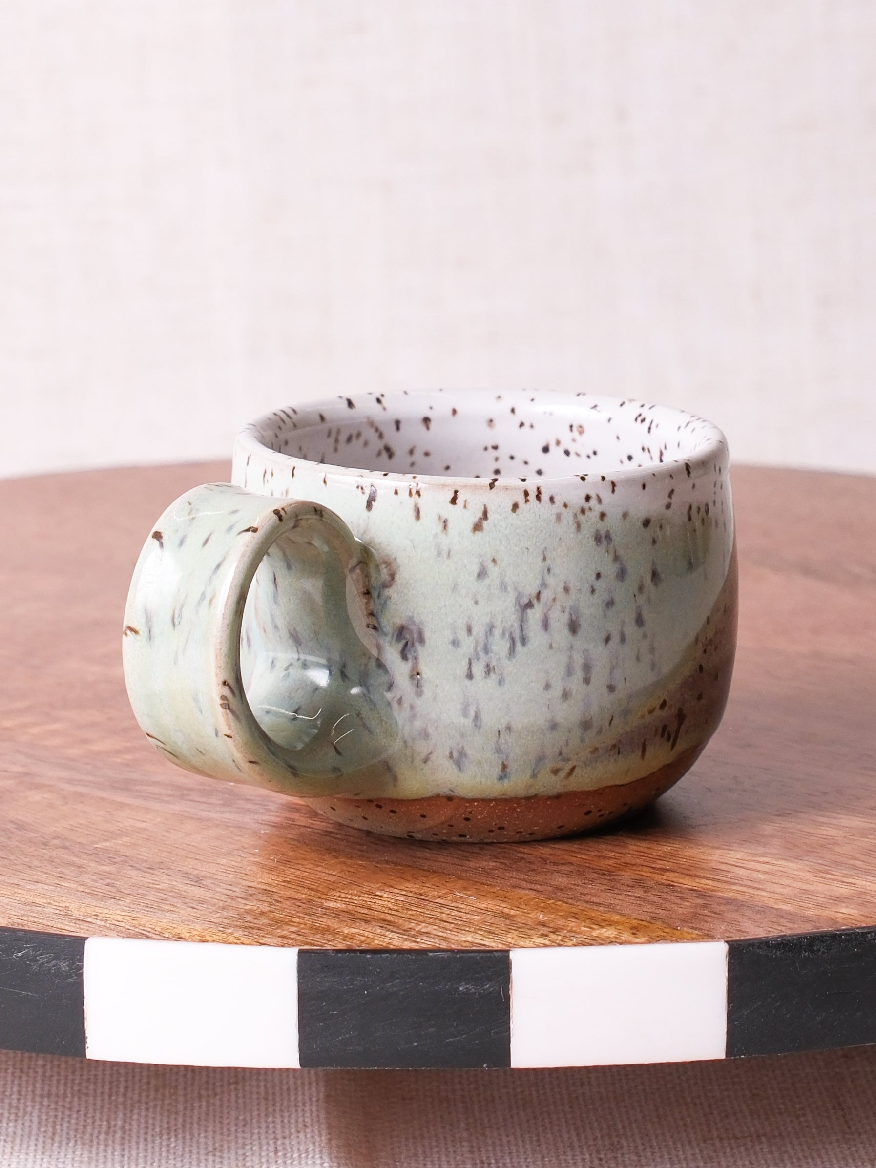 Your favorite espresso deserves a special cup to be enjoyed in. Crafted from stoneware clay on a potter's wheel with a hand-pulled handle. The espresso cup has a rounded shape that flares slightly outward toward the bottom. A sanded flat bottom protects surfaces from scratches. Dipped in our white liner and warm nutmeg glazes, the two create a sweet pale sage where they interact.