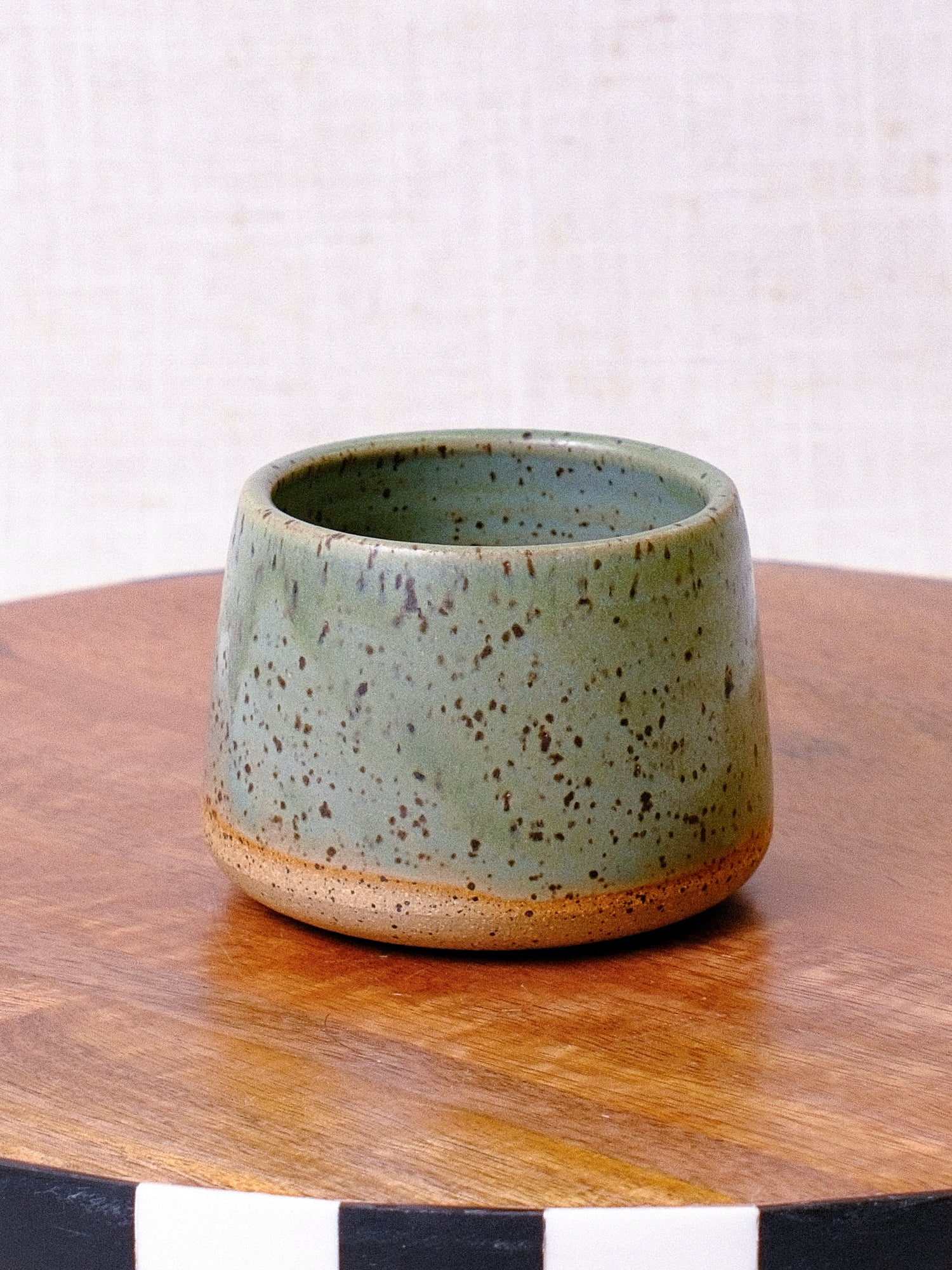 Enjoy your morning coffee with this beautiful cortado sized cup! Can be used for warm or cold beverages. Thrown on a potter's wheel with speckled stoneware clay. Dipped in our classic satin green tea glaze. The speckled clay is exposed at the bottom. Each piece is handmade so they may vary slightly from the photo.