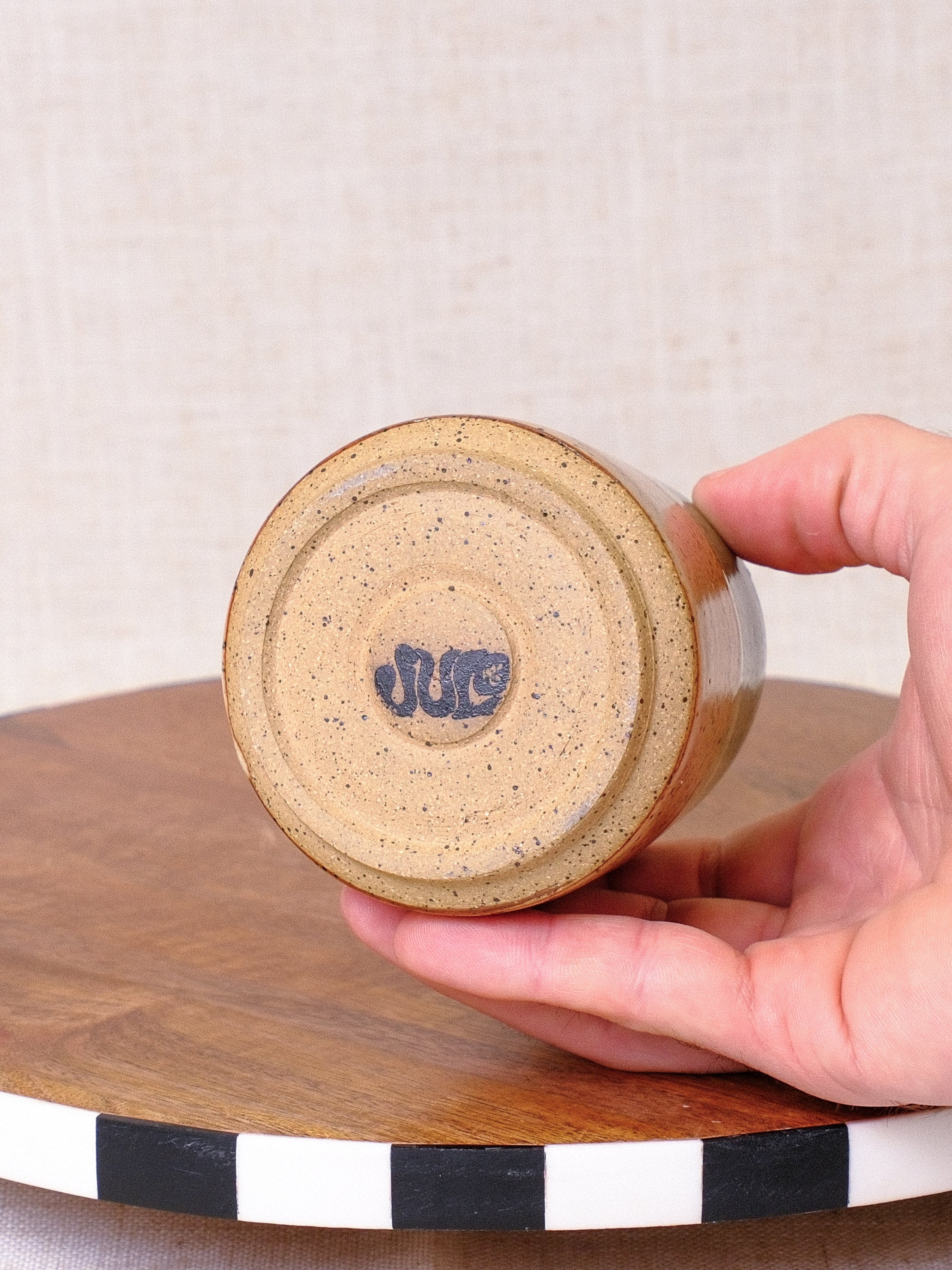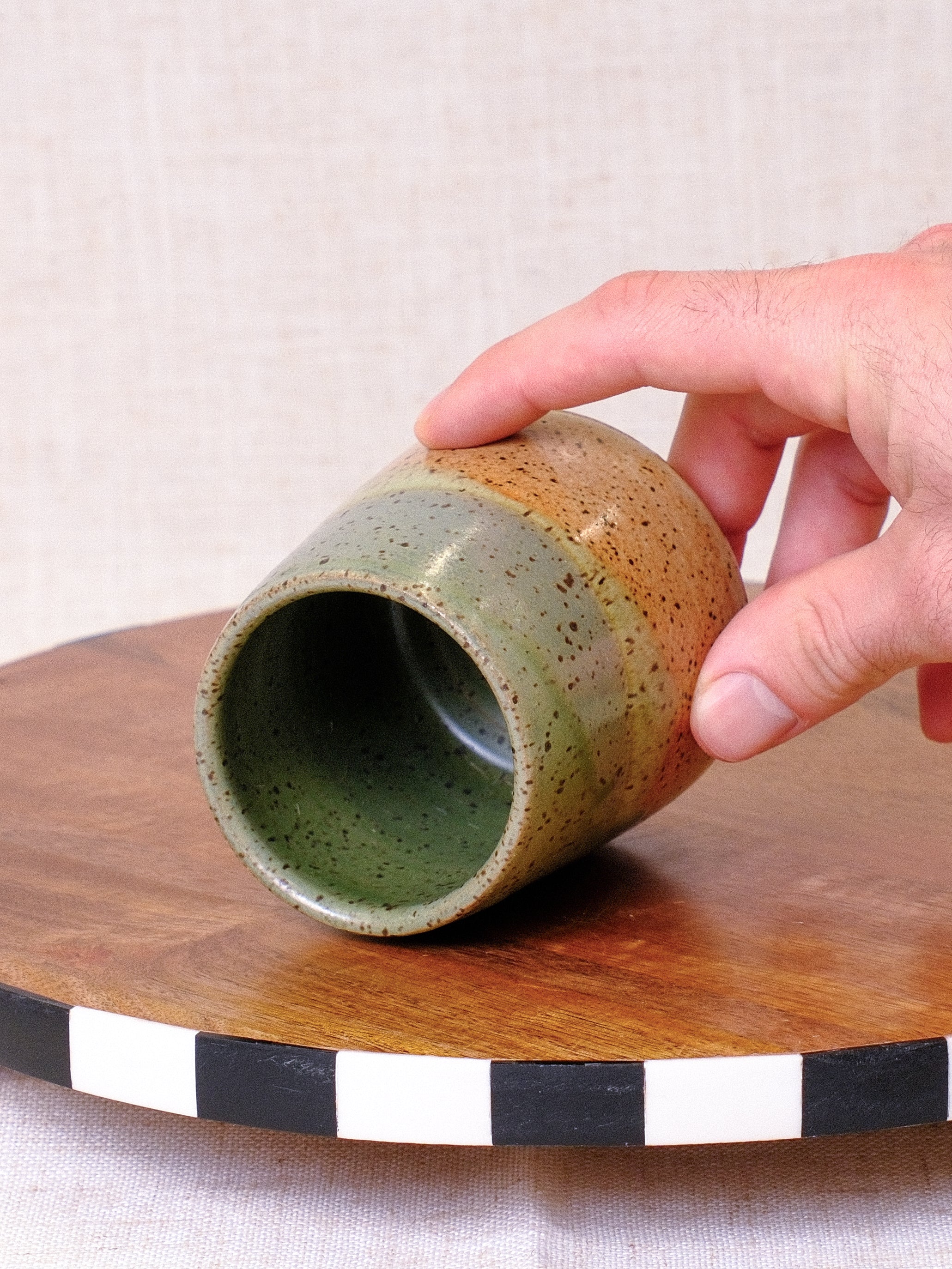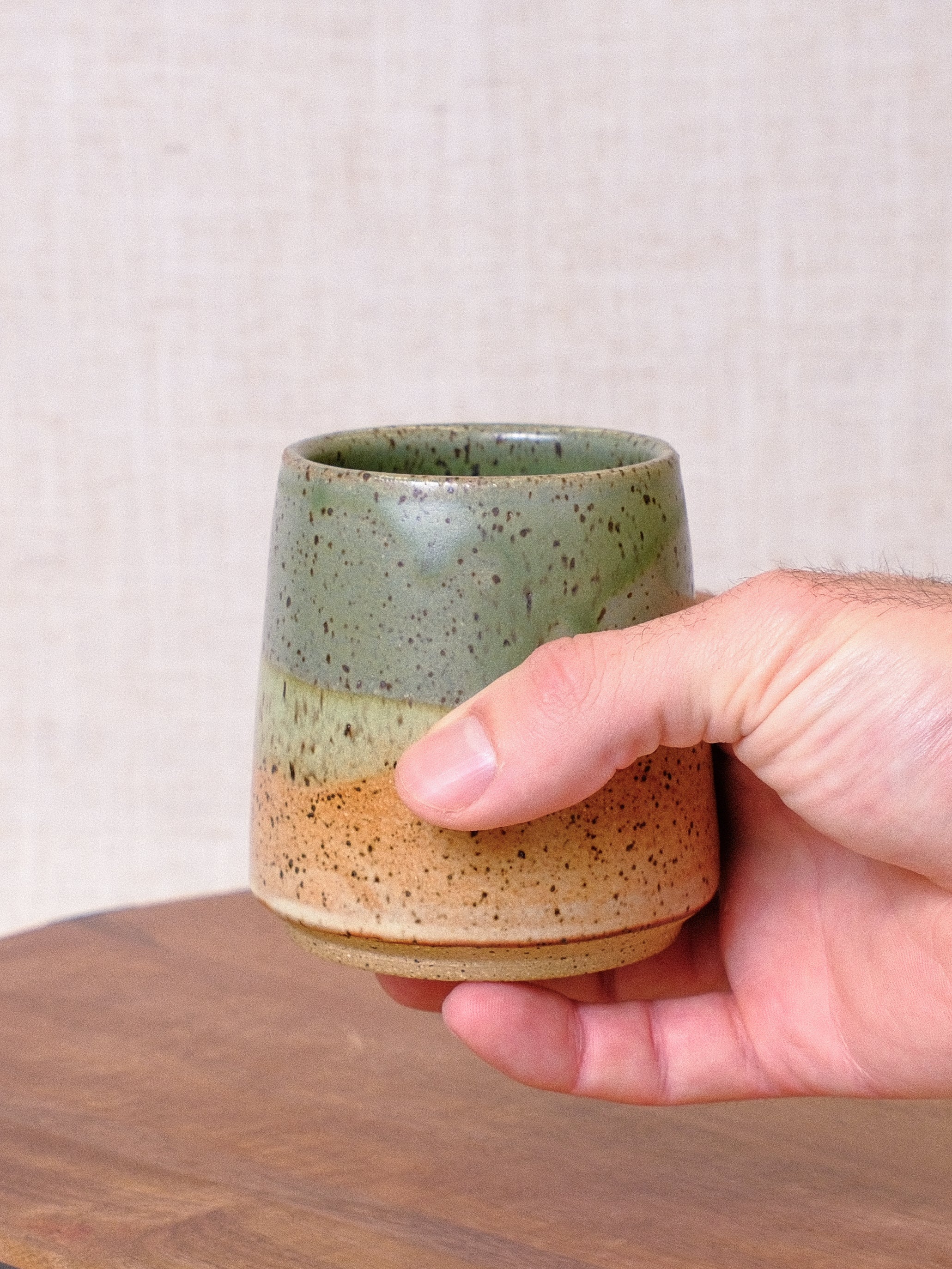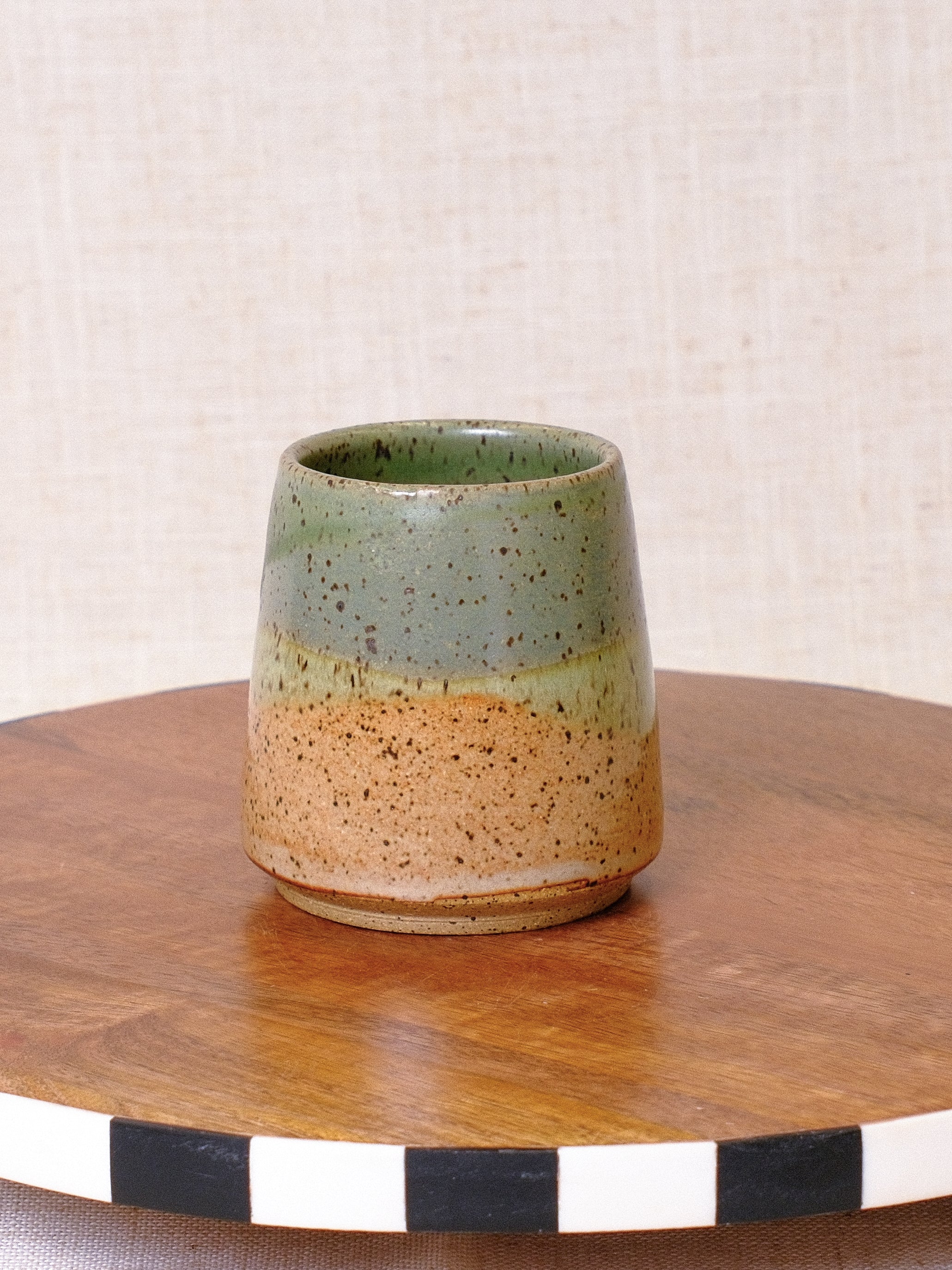 Enjoy your morning coffee with this beautiful cortado sized cup! Can be used for warm or cold beverages. Thrown on a potter's wheel with speckled stoneware clay. Dipped in our classic satin green tea glaze overlaying a warm nutmeg. The speckled clay is exposed at the bottom. Each piece is handmade so they may vary slightly from the photo.